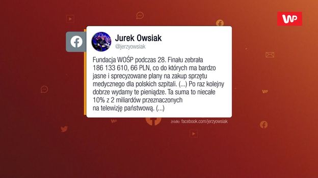 - Nie byłoby Wielkiej Orkiestry Świątecznej Pomocy bez telewizji publicznej - podkreślił w programie WP #Newsroom Janusz Kowalski, wiceminister aktywów państwowych. Jak dodał, "TVP przez 20 lat była partnerem WOŚP, później nie, bo Jerzy Owsiak zajął się propagandą". Cezary Tomczyk zwrócił uwagę, że TVP "na własne życzenie” przestała być partnerem WOŚP, a także, że w jednym z materiałów wymazano serduszko Orkiestry. - Takie rzeczy zdarzały się raczej u Stalina, a nie w CNN - zaznaczył.