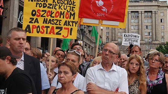 Wiceszefowa SLD Katarzyna Piekarska mówiła do zgromadzonych na Placu Konstytucji, że ważne jest, by "odzyskać państwo, które obecnie zawłaszczone jest przez symbole religijne". Z kolei wicemarszałek sejmu Jerzy Wenderlich przekonywał, że zasada rozdziału Kościoła od państwa nie jest "jakąś fanaberią", tylko europejską normą, wynikającą z konstytucji.
