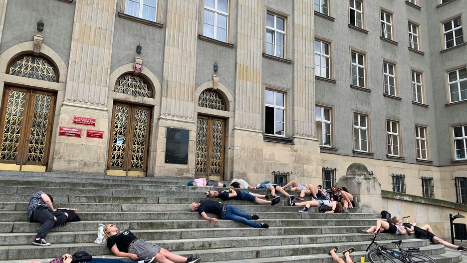 Grupa młodych ludzi leżała na schodach Śląskiego Urzędu Wojewódzkiego w Katowicach, udając martwych. Akcja ma być sprzeciwem wobec katastrofy klimatycznej i bierności polityków i samorządowców.