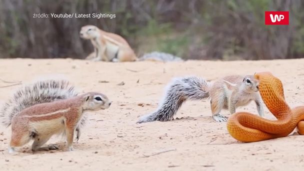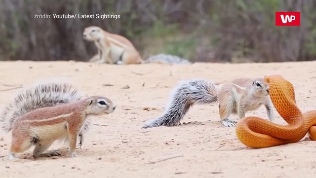 Zdumiewające wideo z Afryki. Wiewiórki i mangusty chcą przegonić kobrę, aby chronić swoje młode. Wszystko wydarzyło się na kempingu Nossob w parku Kgalagadi. - Jedliśmy lunch na kempingu po porannej przejażdżce. Byliśmy trochę rozczarowani, ponieważ nie było żadnych ekscytujących obserwacji zwierząt. Mój mąż był pierwszą osobą, która zobaczyła coś w pobliżu basenu. Kiedy podeszliśmy bliżej, zobaczyliśmy, że wiewiórki próbują trzymać kobrę z dala od nor, w których wychowują młode. Wiewiórki na zmianę atakowały kobrę z różnych stron. Nagle pojawiła się mangusta i przejęła kontrolę - powiedział świadek.