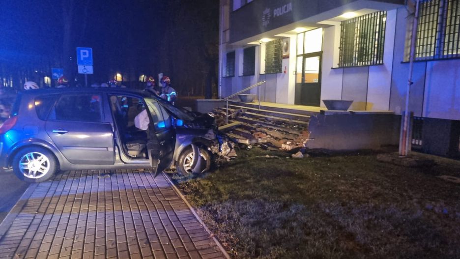 Do zdarzenia doszło w niedzielę około godz. 19.30. Kierowca samochodu marki renault zjechał z jezdni i wjechał w schody miejskiego komisariatu w Tarnowie-Mościcach.