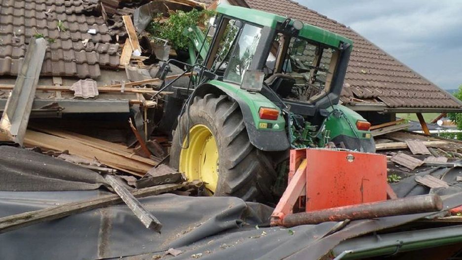 Zanim traktor znalazł się na dachu, dziecko pokonało sporą część łąki, ogrodzenie ogrodu oraz żywopłot.
