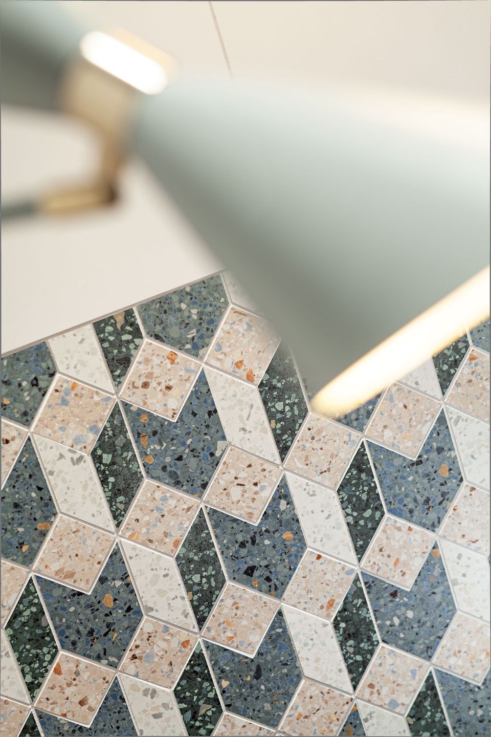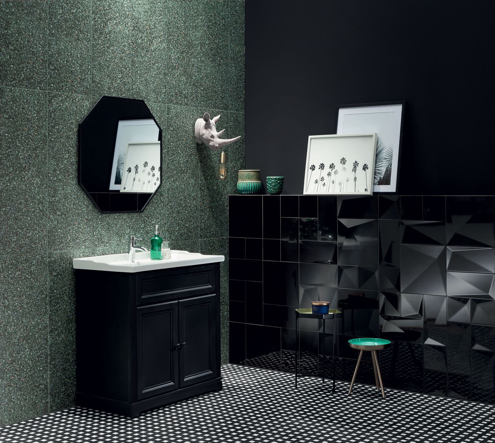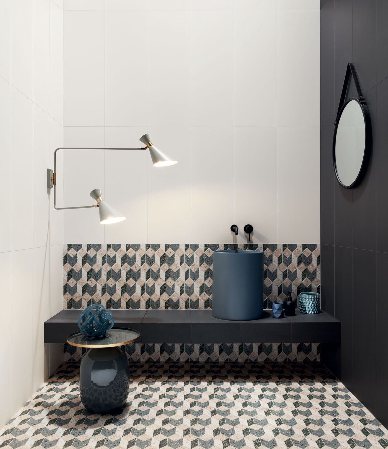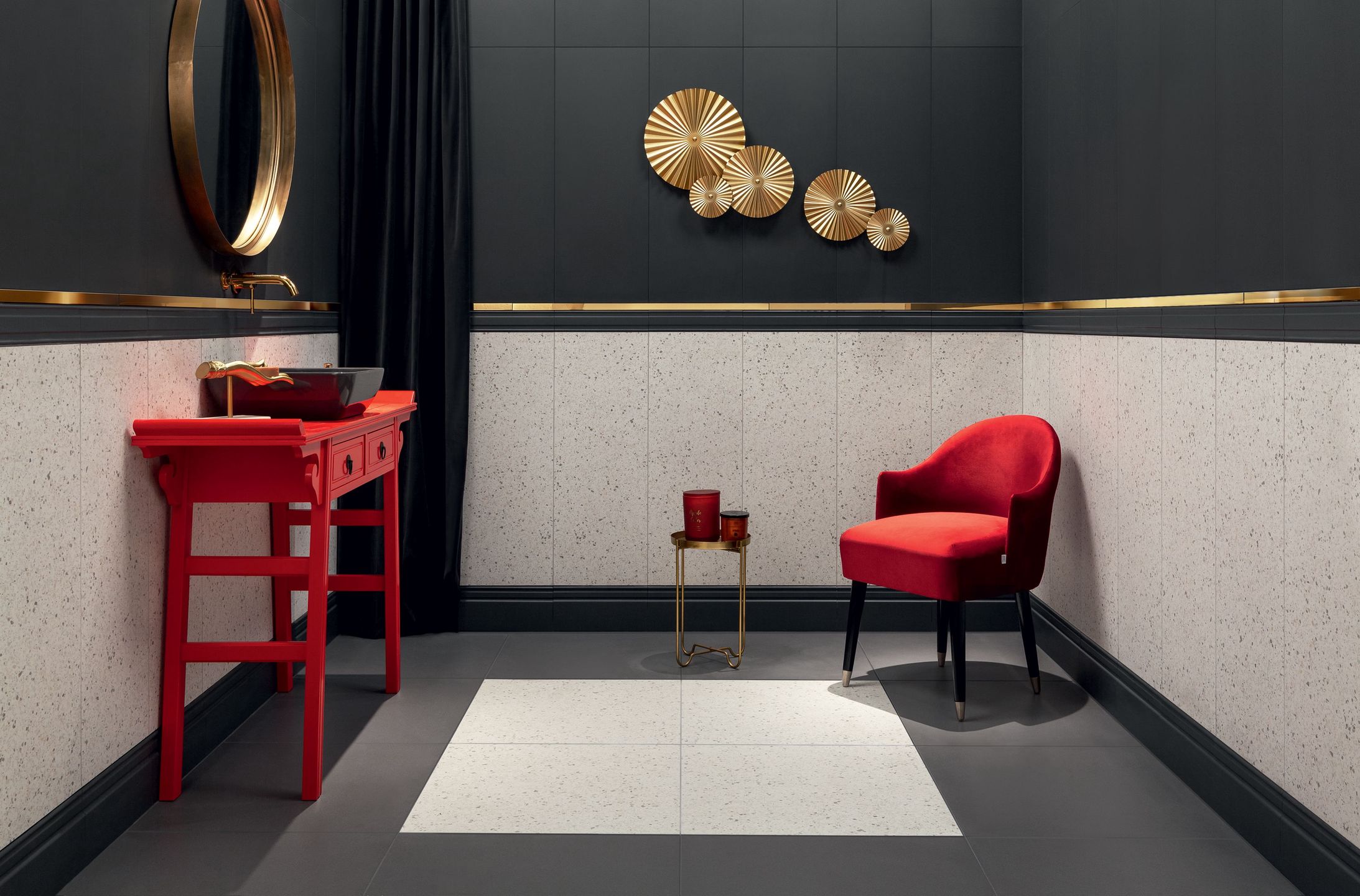 Wolisz surowe, monochromatyczne kolory? W kolekcji Funky znajdziesz też elementy wyróżniające się czarnym połyskiem, który budzi skojarzenia z gładką powierzchnią winylowych płyt. Styl, który w latach 70. i 80. przyciągał wzrok błyszczącymi tkaninami, brokatem, cekinami i lateksem, w najnowszej kolekcji marki Tubądzin został zastąpiony wyrazistymi kształtami, geometryczną formą i ciekawym wzornictwem. Z linią Funky możemy dodać nieco szalonego stylu naszym wnętrzom, zachowując przy tym równowagę barw i elegancję. Odwaga i energia stylu funky oraz jego rytmiczność zostały oddane przy pomocy wyrazistych, geometrycznych figur, które ciekawie korespondują odcieniami ze wzorzystym terazzo. Ogromną zaletą motywu jest możliwość komponowania go w dowolne układy.