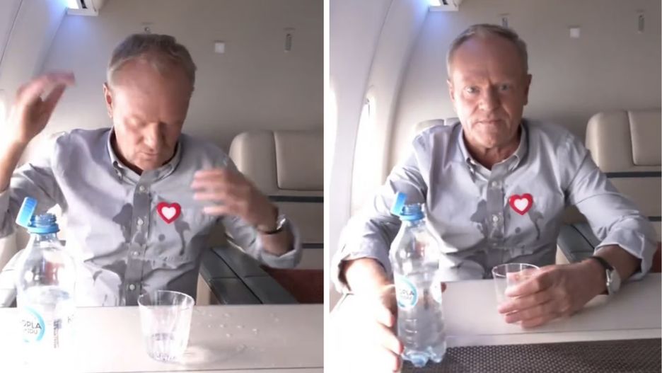 Tusk oblał się wodą w samolocie. Opublikowano nagranie