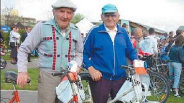 Najstarsi uczestnicy trzeciomajowego Festynu Rowerowego w Miasteczku Rowerowym nad Kamienicą w Nowym Sączu: Kazimierz Śmierciak, lat 92 i Jerzy Lebda, lat 86. Obu panom dopisuje forma. Jeżdżą codziennie, mówią że rower to radość i zdrowie.