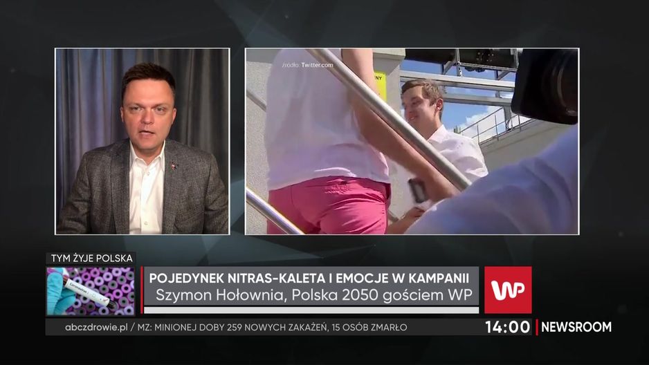 Gościem programu WP "Newsroom" był Szymon Hołownia. Kandydat na prezydenta zapytany został o to, czy w kampanii niekiedy puszczają nerwy. Było to nawiązaniem do przepychanki na schodach przy oczyszczalni ścieków między posłem Nitrasem a posłem Kaletą. W odpowiedzi Hołownia wspomniał o zdjęciu, na które natrafił w sieci. Fotografia przedstawiała właśnie posła Nitrasa, trzymającego w "żelaznym uścisku" ministra Kaletę. Całość opatrzona była podpisem "Jaki kraj taki Titanic". - Jest to w pewnym sensie Titanic. Mam wrażenie, patrząc teraz przed drugą turą wyborów, że polska polityka naprawdę tonie i najgorsze jest to, że toniemy z nią my wszyscy - dodał. Hołownia pokreślił jednocześnie, że sceny agresji obserwuje nie tylko w wykonaniu polityków, którzy "nawzajem szarpią się przy oczyszczalni ścieków", ale też w wielu miejscach odwiedzanych przez kandydatów. Przytoczył tu sytuację, do której doszło w Nowej Soli - spięcia między sympatykami obydwu kandydatów. - Jeszcze tydzień nakręcania emocji i to się może zakończyć tragicznie - zaznaczył. Jego zdaniem kampania ta w żaden sposób nie dotyka już "kwestii merytorycznych". - W ludziach narasta złość i agresja, które wyładowują na sobie nawzajem. Scena z oczyszczalni jest może trochę humorystycznym, trochę parodystycznym, ale jednak też tragicznym czubkiem góry lodowej - spuentował.