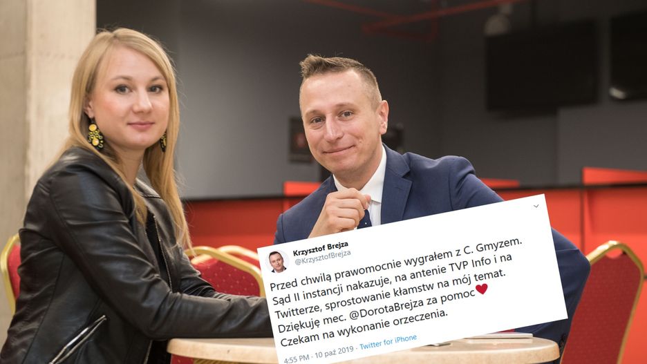 W czwartek Brezja poinformował, że wygrał z Cezarym Gmyzem w drugiej instancji "Dziękuję mecenas Dorocie Brejzie (żona posła - przyp. red.) za pomoc. Czekam na wykonanie orzeczenia" - napisał na Twitterze.