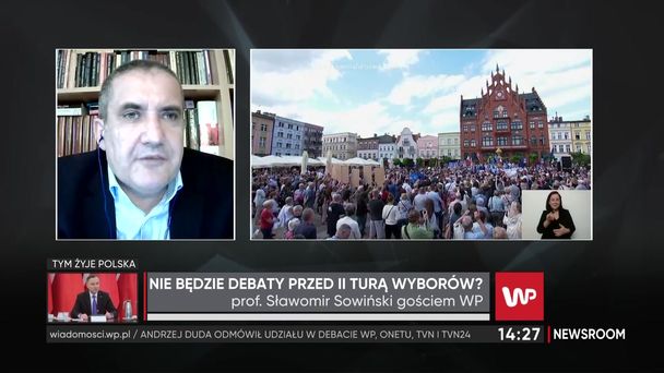 Czy dojdzie do debaty przed II turą wyborów prezydenckich? Na to pytanie w programie Newsroom WP odpowiadał prof. Sławomir Sowiński. Zdaniem politologa udział w debacie nie jest w interesie Andrzeja Dudy. - To on jest dzisiaj faworytem, to za nim stoi statystyka, to on ma bliżej do mety. Podejmowanie debaty jest ryzykiem. Jest tym, czym są rzuty karne w trudnym meczu piłkarskim - tłumaczył prof. Sowiński. Jak dodał, mimo niekorzystnych warunków, Rafał Trzaskowski powinien wziąć udział w debacie TVP w Końskich. - Dobre sprawowanie prezydentury to nie tylko zbieranie oklasków przy ładnej pogodzie, ale też branie na polityczne barki najtrudniejszych sytuacji. Rafał Trzaskowski powinien spróbować zmierzyć się z prezydentem Andrzejem Dudą w jego środowisku, w jego mateczniku i przy jego publiczności - podkreślił politolog. Zdaniem prof. Sowińskiego to niebywała okazja kandydata KO dla zademonstrowania swojej siły i odwagi.
