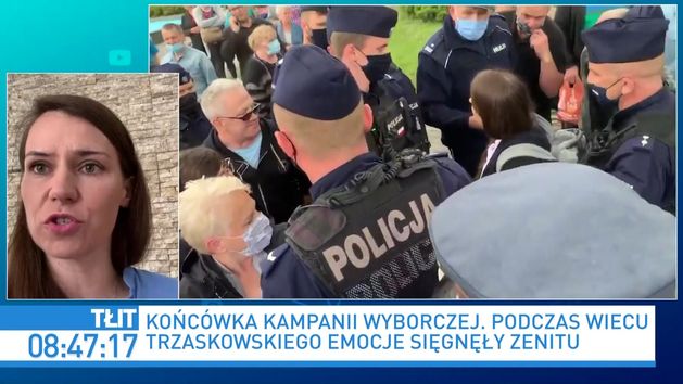 Wybory prezydenckie. Przepychanki na spotkaniu z Rafałem Trzaskowskim. - Rzeczywiście w Dębicy zebrała się grupa zwolenników Andrzeja Dudy, grupa bardzo agresywna, używająca wulgaryzmów. Postanowiłam zareagować, bo uważam, że granice dobrego smaku zostały przekroczone. Każdy ma prawo do protestu, do demonstrowania swojego zdania, ale wtedy, kiedy mamy do czynienia nie tylko z agresją słowną, ale fizyczną wobec innych uczestników, trzeba reagować. Uznałam, że trzeba ten festiwal nienawiści w Dębicy przerwać - komentuje sytuację w programie "Tłit" Agnieszka Pomaska. Powiedziała, że jest rozczarowana postawą policji, która jej zdaniem nie reagowała odpowiednio. Na zarzuty, że to posłanka prowokowała zwolenników Dudy, wyłączając sprzęt nagłaśniający. - Wyłączyłam głośnik, z którego płynęły obelżywe hasła w obecności dzieci. Zostałam przy tej sytuacji, jak i wcześniej, uderzona - tłumaczyła.