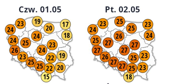 Jak widać na mapach IMGW, pierwszy dzień majowego weekendu zapowiada się przyjemnie. Najchłodniej może być w okolicach Suwałk. Upalnie natomiast zapowiada się piątek. W centrum i na zachodzie temperatury mają dojść do 27 st. C.