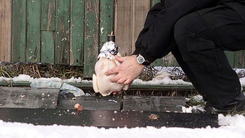 Warszawa, 29.12.2009. Funkcjonariusze jednostki Minersko Saperskiej Komendy Stołecznej Policji zaprezentowali na przykładzie surowego kurczaka, jakie szkody może wyrządzić petarda, odpalona w pobliżu ludzkiego ciała.
