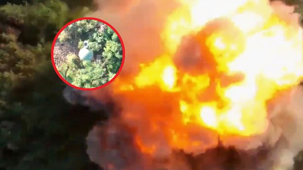 Potężna eksplozja na froncie. Żołnierze z 68. Oddzielnej Brygady Myśliwskiej imienia Ołeksija Dowbusza udostępnili nagranie, na którym widać moment ataku na rosyjski skład min przeciwczołgowych. Materiał udostępniła również agencja Reutera. Do uderzenia użyto zwykłego granatu wojskowego, który przymocowano do drona i spuszczono nad gęstym lasem. Po chwili doszło do silnego wybuchu. Eksplozji towarzyszyła ogromna siła rażenia, a także wielkie kule ognia i kłęby czarnego dymu. Wojskowi z 68. Brygady pochwalili się swoją udaną misją także na Telegramie. "Wielki huk od jednego granatu! Szerszenie Dowbusza trafiły w skład min przeciwpancernych wroga. W otrzymanych nagraniach okupanci nazwali to małą eksplozją nuklearną" - brzmiał podpis pod nagraniem. Ten atak przeprowadzono niedaleko Zaporoża, gdzie Ukraińcy w ostatnim czasie zadają coraz więcej strat Rosjanom w ramach trwającej kontrofensywy.