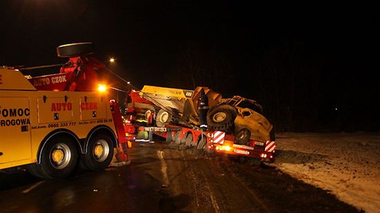 Przyczyną zjechania zestawu z 20-tonowym ładunkiem do rowu było uszkodzenie hydrauliki naczepy.