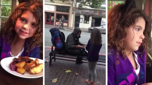 Ella, kilkuletnia dziewczynka z Kalifornii siedziała z tatą w restauracji, gdy dostrzegła za oknem bezdomnego mężczyznę. Na ten widok postanowiła odstąpić swój posiłek, wpierw pytając o zgodę ojca.