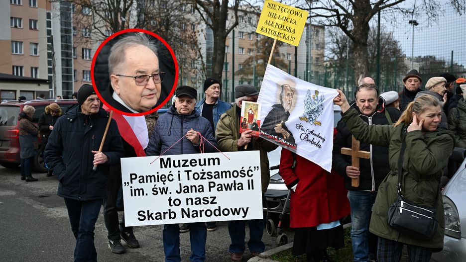 Na około pół godziny przed przesłuchaniem, przed wejściem do gmachu, zgromadziło się około 60 osób. Uczestnicy odmawiali różaniec, mieli ze sobą biało-czerwone flagi, krzyże oraz transparenty z hasłami: "Nie tęczowa, nie laicka, ale Polska katolicka" czy "Muzeum Pamięć i Tożsamość im. św. Jana Pawła II to nasz Skarb Narodowy. Sytuację na miejscu monitorowała policja.