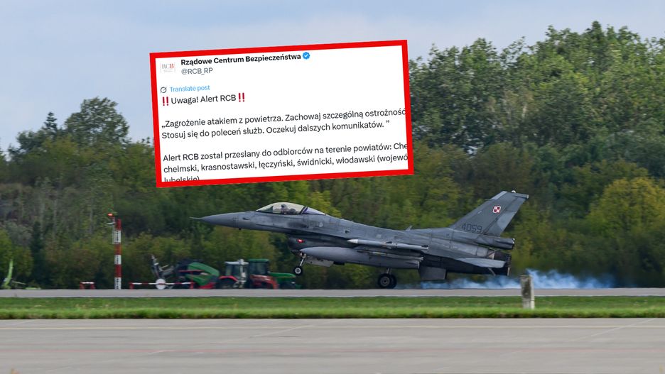 "Zagrożenie atakiem z powietrza. Zachowaj szczególną ostrożność. Stosuj się do poleceń służb. Oczekuj dalszych komunikatów. " - alert RCB o takiej treści został przesłany do odbiorców na terenie powiatów: Chełm, chełmski, krasnostawski, łęczyński, świdnicki, włodawski (województwo lubelskie).