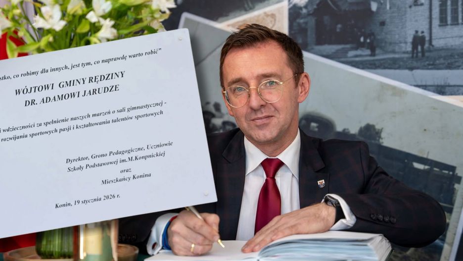 Tablica na cześć wójta gminy Rędziny zawisła na ścianie nowej sali gimnastycznej w Koninie koło Częstochowy. Wójt Adam Jaruga (PSL) przekonuje, że o niczym nie wiedział. A pomysłodawczyni, czyli dyrektor szkoły zarzeka się, że "tablica nie jest wyrazem propagandy".