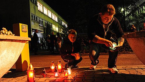 Mieszkańcy zapalają znicze przed bramą kopalni "Wujek-Śląsk" w Rudzie Śląskiej-Kochłowicach, gdzie 12 górników zginęło, a 18 zostało ciężko rannych, wskutek zapłonu metanu w kopalni.