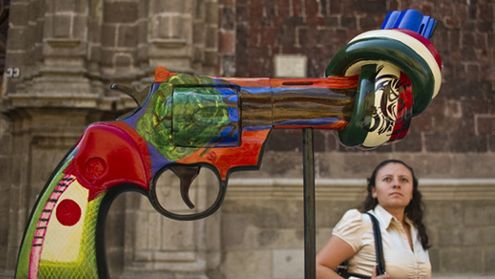 W stolicy Meksyku stanęły wyjątkowe rzeźby. Olbrzymie rewolwery z zawiązanymi lufami to znany na całym świecie symbol pokoju. Nic dziwnego, że prace te stanęły właśnie w Meksyku, gdyż jak podają statystyki tylko w tym kraju, od grudnia 2006 roku w wojnach narkotykowych zginęło około 41 tysięcy osób.
