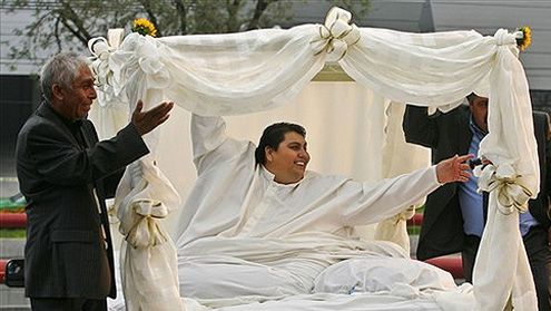 Manuel od sześciu lat przykuty do łóżka swymi setkami kilogramów ubrał się na tę okazję w białą jedwabną koszulę i z uśmiechem patrzył na narzeczoną, 38-letnią Claudię Solis, która zeszła do niego po schodach w sukni bez ramiączek, koloru kości słoniowej.