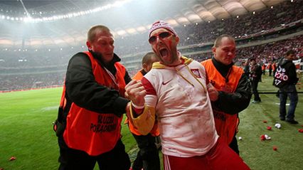 Ochrona wyprowadza polskiego kibica, jednego z "bohaterów Stadionu Narodowego" z boiska przed meczem eliminacyjnym piłkarskich mistrzostw świata Polska - Anglia.