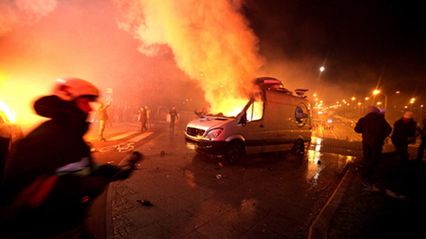 Strażacy gaszą podpalony wóz transmisyjny TVN24. Zamieszki na Placu Na Rozdrożu, gdzie z Placu Konstytucji dotarł "Marsz Niepodległości".