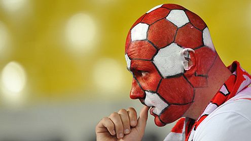 Chorwacki fan w strefie dla kibiców ogląda mecz z Austrią.