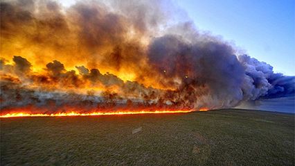 Widok z lotu ptaka na pożar, jaki wybuchł na początku tygodnia na stacji ekologicznej Taim i przez kilka dni objął swoim zasięgiem powierzchnię ponad 550 hektarów. Pożar wciąż się rozprzestrzenia i nie można go ugasić, ponieważ nie ma możliwości dostania się w jego okolice drogą morską lub lądową.