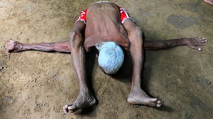 Hinduski zapaśnik rozgrzewa się przed walką. Tradycyjne zapasy zorganizowano z okazji Nagapańćami - hinduskiego święta węży.