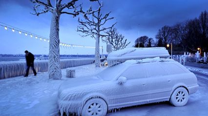 Niemal cała Europa zmaga się z silnym mrozem. Na zdjęciu niefortunnie zaparkowane auto, które zalała fala z jeziora Genewskiego.