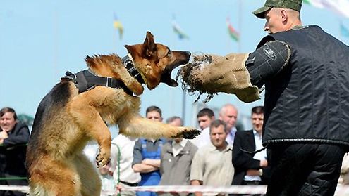 Białoruski żołnierz prezentuje umiejętności psa, podczas ceremonii otwarcia "MILEX 2011" wystawy broni i sprzętu wojskowego w Mińsku.