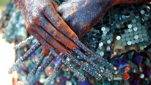 Modelka w barwnej charakteryzacji podczas wystawy "Hair and Beauty" w Pekinie.