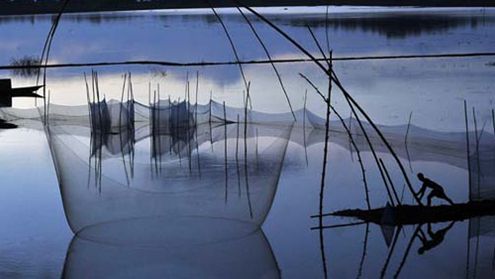 Rybak łapie ryby w sieć nieopodal wioski Budhabudhi w Indiach.