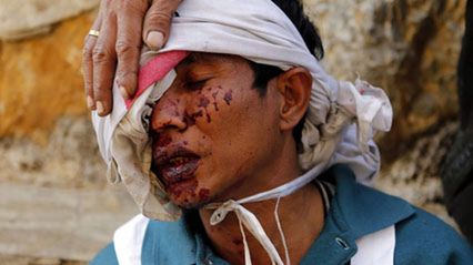 W birmańskiej prowincji Shan, gdzie armia prowadzi walki z przedstawicielami mniejszości Kokang, po raz kolejny w ostatnich tygodniach doszło do krwawych starć. Kilka miesięcy temu do Birmy wrócił z Chin jeden z partyzanckich liderów (Phone Kya Shin), co zapoczątkowało wzmocnienie napięć i aktywności partyzantów. Na zdjęciu jeden z wolontariuszy Czerwonego Krzyża ranny po ataku bojówkarzy Kokang na konwój ciężarówek.