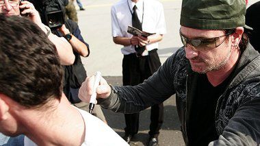 Wbrew wcześniejszym informacjom organizatorów, po wyjściu z samolotu Bono nie tylko nie wsiadł natychmiast do czekającego na płycie czarnego porsche cyaenne, ale sam podszedł do specjalnego ogródka, przygotowanego dla dziennikarzy i grupki fanów.