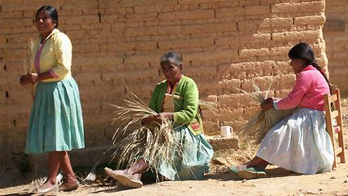 Kobiety tkają kapelusze z liści palmowych.