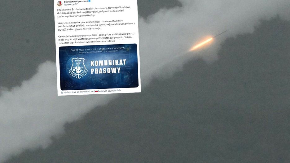 "Informujemy, że obserwowana jest intensywna aktywność lotnictwa dalekiego zasięgu Federacji Rosyjskiej, związana z uderzeniami rakietowymi na terytorium Ukrainy. Wszystkie niezbędne procedury mające na celu zapewnienie bezpieczeństwa polskiej przestrzeni powietrznej zostały uruchomione, a DO RSZ na bieżąco monitoruje sytuację. Ostrzegamy, że aktywowano polskie i sojusznicze statki powietrzne, co może wiązać się z występowaniem podwyższonego poziomu hałasu, zwłaszcza w południowo-wschodnim obszarze kraju" - podało Dowództwo Operacyjne Rodzajów Sił Zbrojnych.