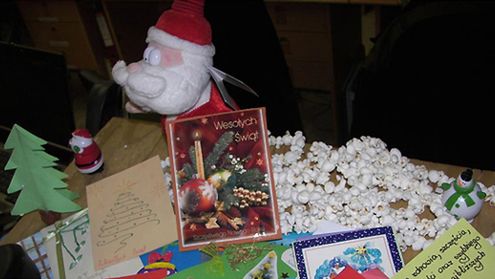 Wszystkie otrzymane kolorowe kartki świąteczne zostały umieszczone na ścianach pomieszczeń, gdzie pracują i odpoczywają żołnierze.